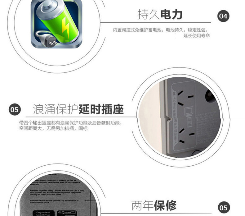 | 有聲報(bào)警 | 市電停電時(shí)報(bào)警:低電量電池報(bào)警 | 浪涌能量額定值 | 160焦耳 |