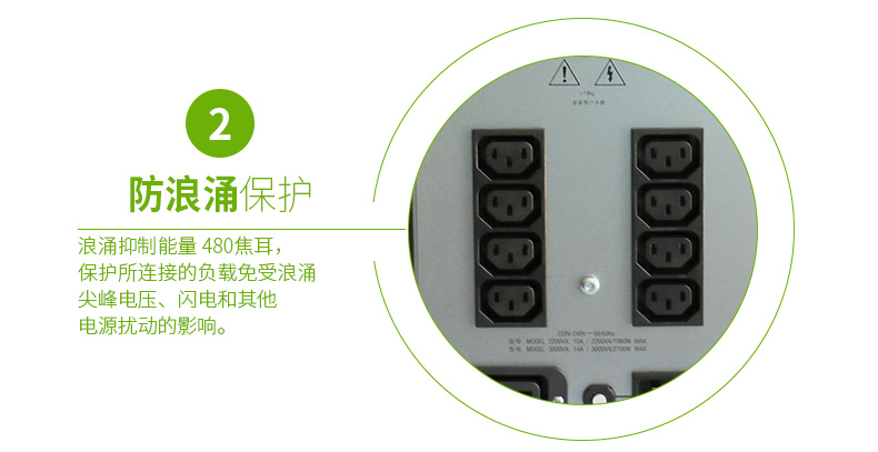 | 浪涌能量額定值 | 480焦耳 | 控制盤 | 發(fā)光二極管顯示在線運行,電池運行,過載和電池需要更換 |