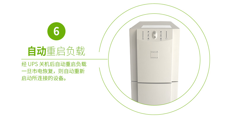 經(jīng)UPS關(guān)機(jī)后自動(dòng)重啟負(fù)載:一旦市電恢復(fù),則自動(dòng)重新啟動(dòng)所連接的設(shè)備。