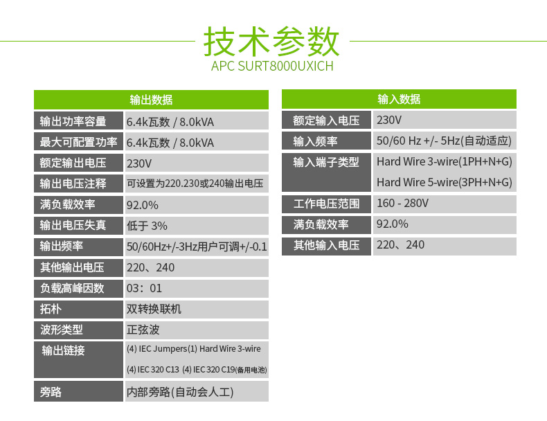 | 輸出連接 | IEC Jumpers (備用電池)IEC 320 C13 (備用電池)IEC 320 C19 (備用電池)Hard Wire 3-wire (H N + G) (備用電池) |