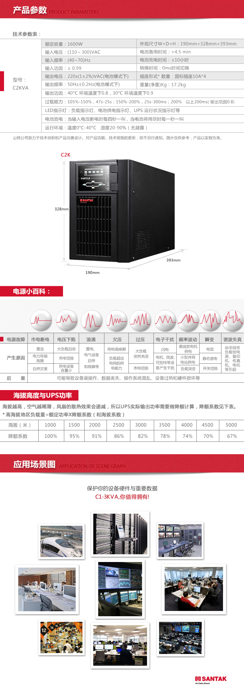 山特C2K系列UPS---是目前中國市場存量廣,暢銷的在線式UPS。通過30年的經(jīng)驗(yàn)積累,先進(jìn)的數(shù)字化控制技術(shù),在解決9種電力問題(市電斷電、電壓下陷、浪涌、欠壓、過壓、電子干擾、頻率波動(dòng)、瞬變、諧波失 真、其他)的基礎(chǔ)上,進(jìn)一步提高了產(chǎn)品的適應(yīng)性和可靠性,為用戶設(shè)備以及UPS 本身提供萬無一失的保障。
