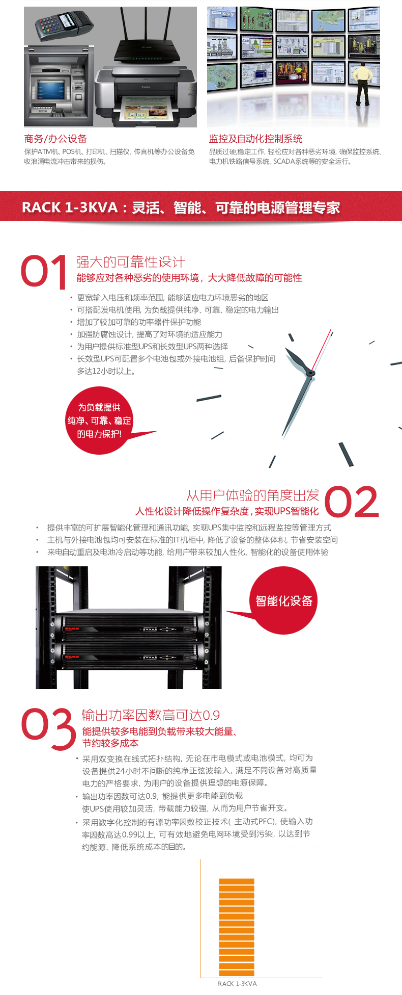 Rack UPS具備輸入功因修正功能,在滿載情況下,輸入功因可以達(dá)到0.95以上,使用戶的電網(wǎng)環(huán)境不會受到污染。