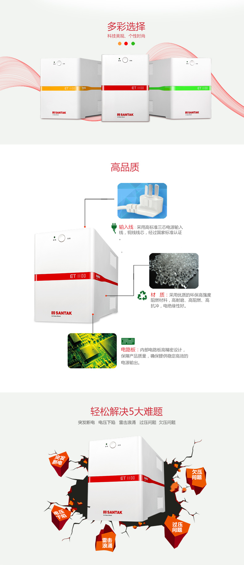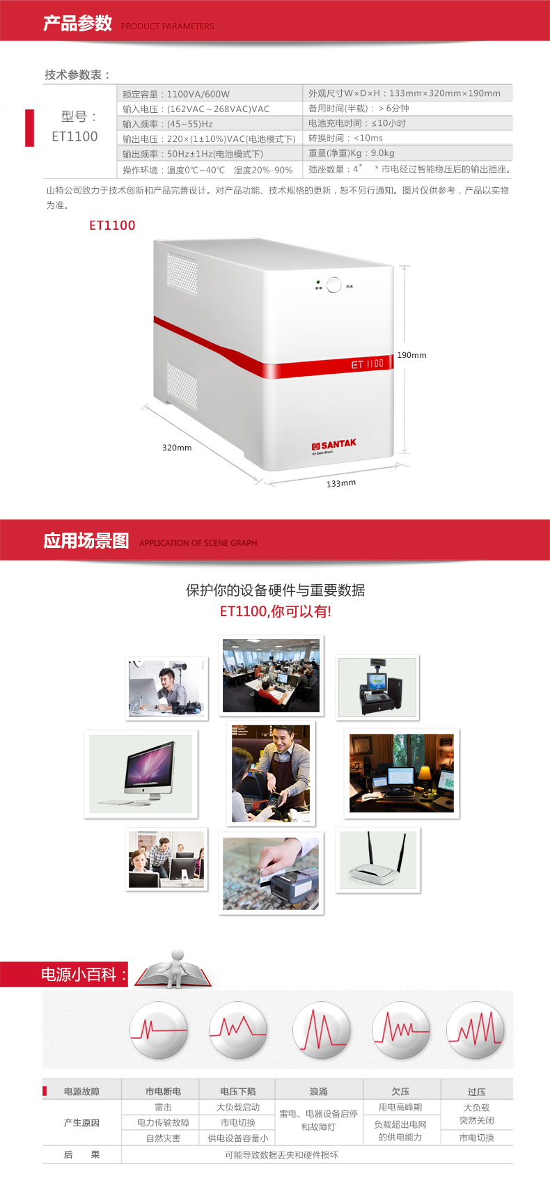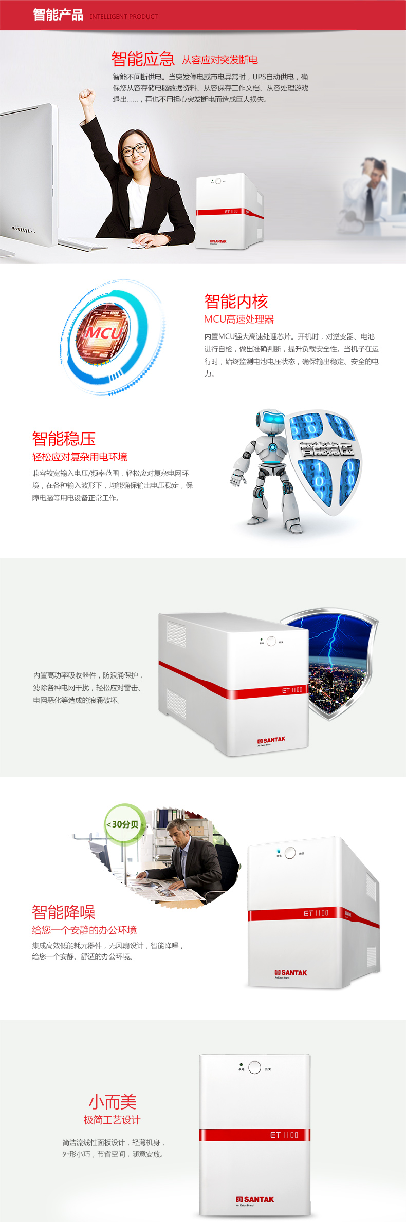山特ET1100 UPS是針對(duì)中國(guó)電力環(huán)境設(shè)計(jì)的自動(dòng)穩(wěn)壓型智能UPS,內(nèi)置先進(jìn)的MCU控制單元,有效的解決5 種電力問題:市電斷電、電壓下陷、浪涌、欠壓、過壓。功能強(qiáng)大,美觀時(shí)尚,是電腦、POS機(jī)、收銀臺(tái)、ATM、路由器、閘機(jī)等設(shè)備的最佳保護(hù)。