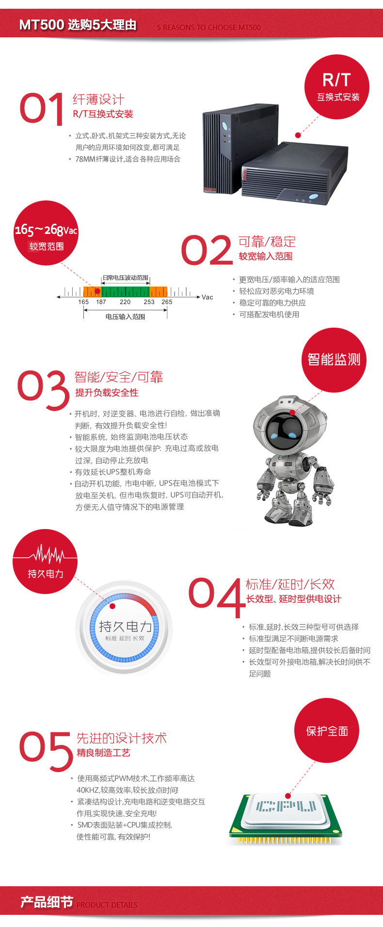 MT- pro系列是智能上網(wǎng)型UPS,可提供各種通訊連接方式的電源管理方案。采用先進的CPU集成控制技術(shù),并擁有超寬電壓輸入范圍和獨特的立式、臥式、機架 式三種安裝方式;還特別配置穩(wěn)壓輸出電源插座、浪涌保護插座和智能插卡,是中小企業(yè)、政府及教育等行業(yè)的服務(wù)器、網(wǎng)絡(luò)設(shè)備及工控產(chǎn)品的理想保護電源。