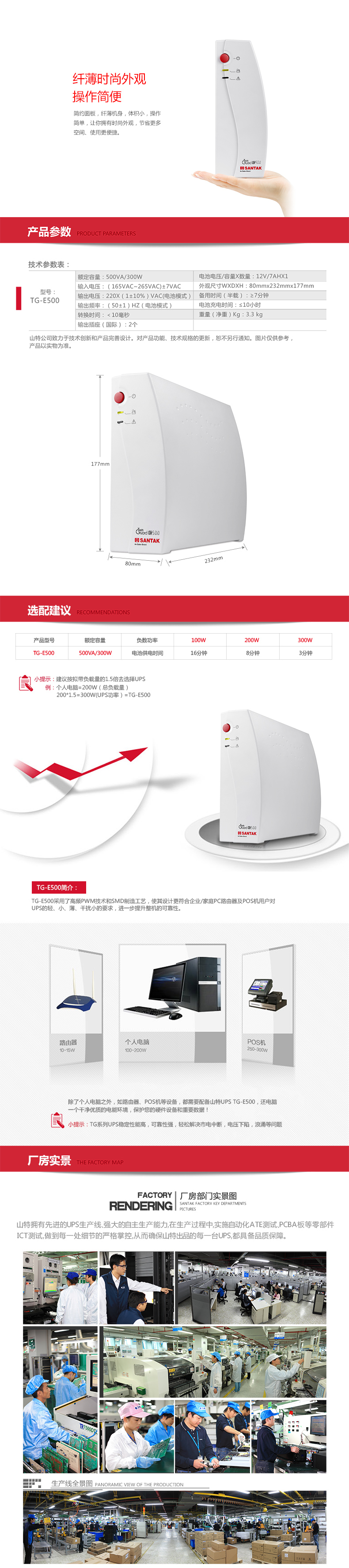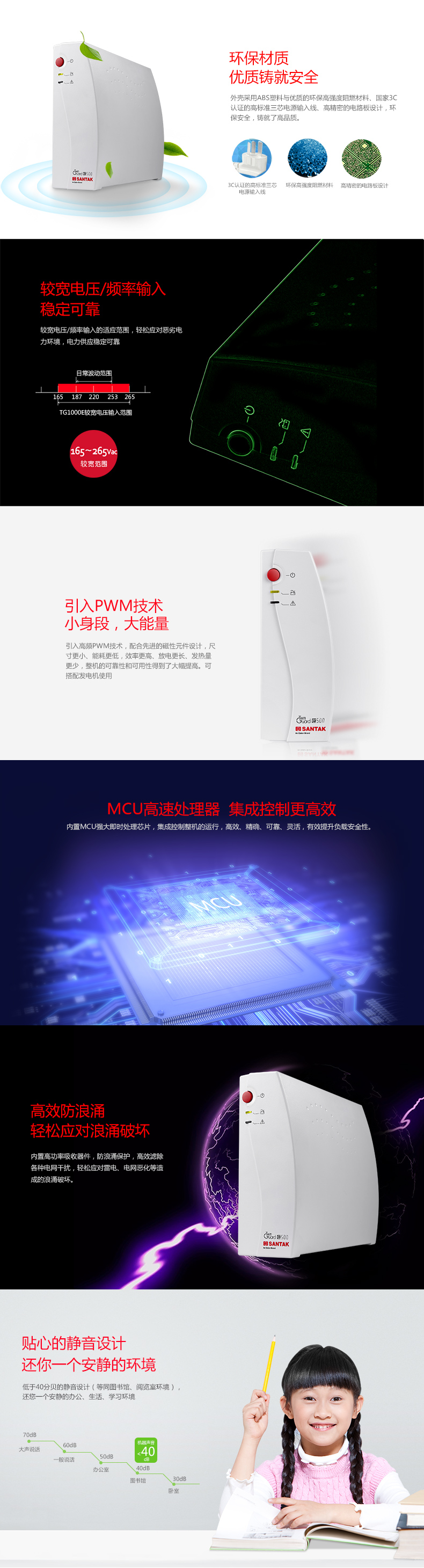 山特后備式TG-E500系列UPS---美觀時(shí)尚的“設(shè)備守護(hù)神”。TG-E1000/E500 UPS功能強(qiáng)大,集智慧、安全、可靠 于一身,全面提升消費(fèi)者在產(chǎn)品品質(zhì)、觀感、質(zhì)感方面的使用體驗(yàn)。這款UPS針對(duì)中國(guó)市場(chǎng)電力環(huán)境優(yōu)化設(shè)計(jì),內(nèi)置先進(jìn)的MCU控制單元,使用環(huán)保的ABS塑料,做工精美,有效的解決5種常見電力問題:市電斷電、電壓下陷、浪涌、欠壓、過壓。TG-E500 UPS 小身段,大能量,守護(hù)個(gè)人和辦公電腦、商務(wù)設(shè)備等硬件設(shè)備和數(shù)據(jù)的安全。